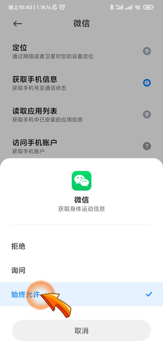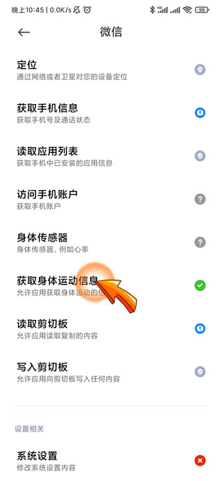 6、进入权限管理页面后点击“获取身体运动信息”选项。