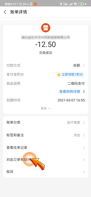 4、之后点击账单详细页面中的“对此订单有疑问”选项。
