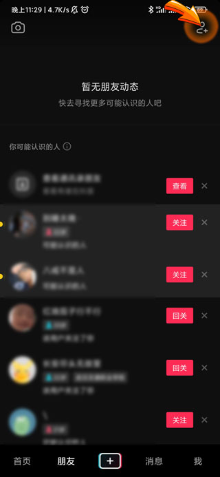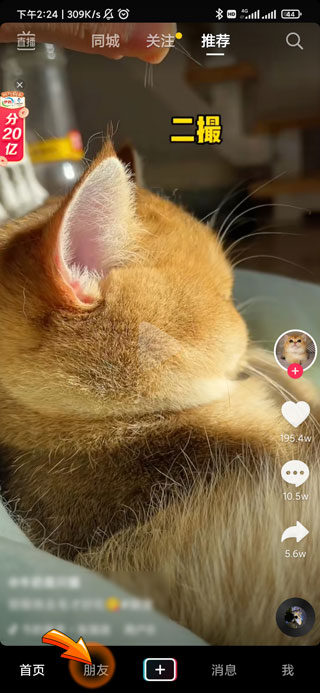 1、抖音查看通讯录朋友需要打开抖音APP,点击页面下方首页右侧的“朋友”选项。