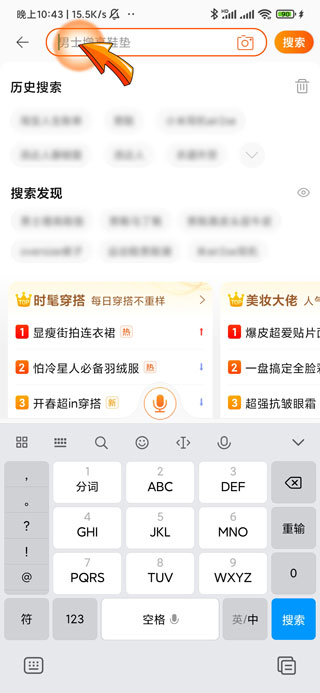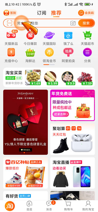 1、淘宝查看总消费信息首先需要打开淘宝APP,点击首页顶部的“搜索栏”图标。