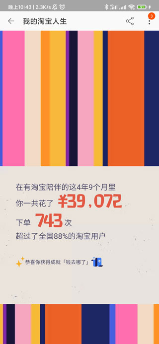 3、此时会出现我的淘宝人生页面,即可查看淘宝的总消费。