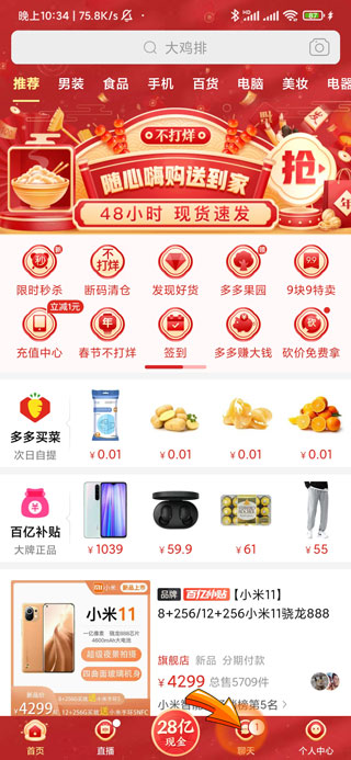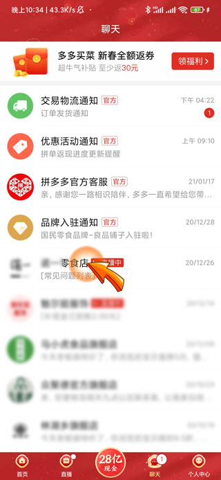 1、拼多多投诉卖家首先需要打开拼多多APP,点击页面下方的“聊天”选项。