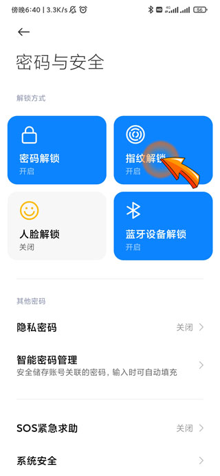 3、进入密码与安全页面后,点击“指纹解锁”选项。