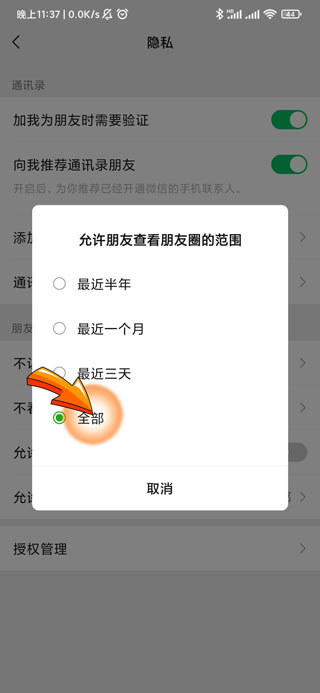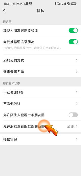4、再点击隐私页面中的“允许朋友查看朋友圈的范围”选项。