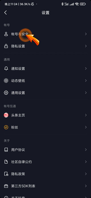 4、再点击设置页面中的“账号与安全”选项。