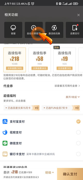 5、此时页面上方会弹出窗口,点击其中的“自动续费管理”选项。