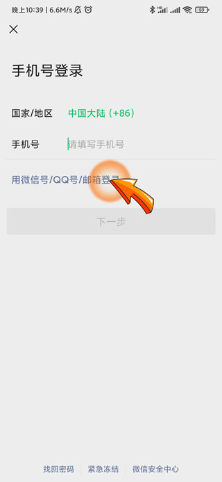 2、此时一般默认为手机号登录,点击“用微信号/QQ号/邮箱登录”选项。