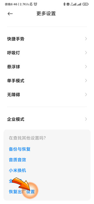 3、之后将页面滑到底部,点击“恢复出厂设置”选项。