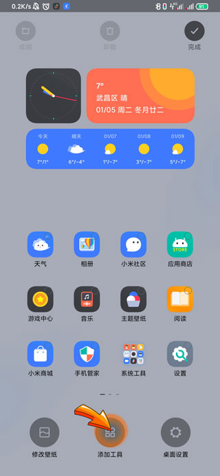 手机屏幕上的日期和时间没有了需要添加时钟工具,首先长按桌面上的“空白区域”,此时页面会弹出多个图标,点击下方中部的“添加工具”图标,最后选择并点击“时钟”图标即可。