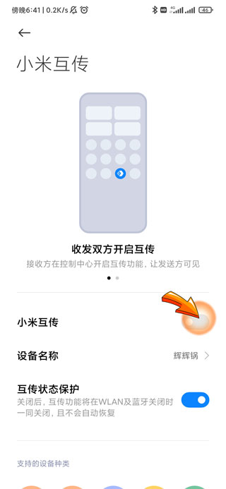 4、最后点击打开小米互传右侧的“开关”按钮即可进行互传。