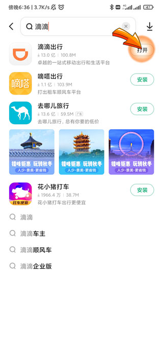 下载滴滴打车软件首先需要点击桌面上的“应用商店”选项,进入应用商店页面后,点击上方的“输入栏”图标,输入滴滴文字后,页面下方就会出现相对应的软件,然后点击右侧的“安装”选项即可下载。