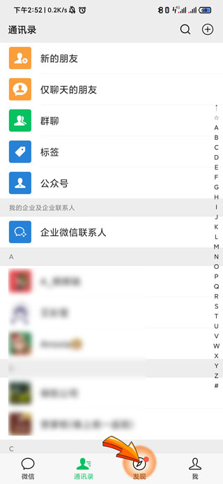 1、微信添加附近的人首先需要打开微信APP,点击首页右下角的“发现”图标。