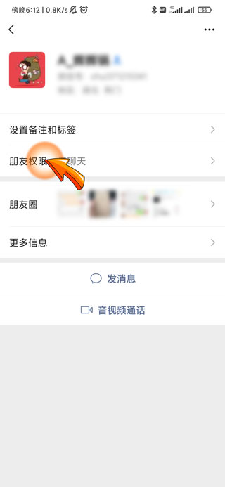 朋友圈设置权限需要打开微信APP,点击对方的“头像”图标,然后点击对方主页中的“朋友权限”选项,之后点击“聊天、朋友圈、微信运动等”选项,最后将下方的两个“开关”按钮关闭即可。