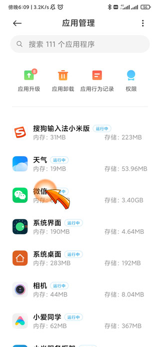 3、进入应用管理页面后,找到并点击“微信”选项。