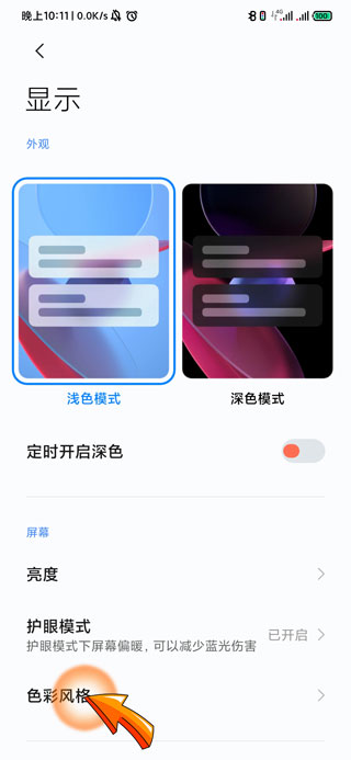 3、进入显示页面后,点击页面底部的“色彩风格”选项。