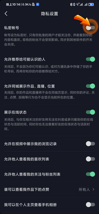 5、最后点击“私密账号”右侧的开关按钮,将其关闭即可。
