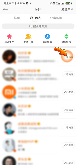 4、最后点击对方头像右侧的“已关注”选项,即可将对方取消关注。
