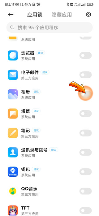 4、最后找到相册图标并点击开启右侧的“开关”按钮即可。