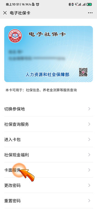 6、进入电子社保卡页面后,点击下方的“卡面服务”选项。
