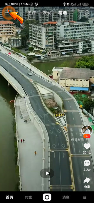 1、快手查看快币首先需要打开快手APP,点击首页左上角的“三横”符号。