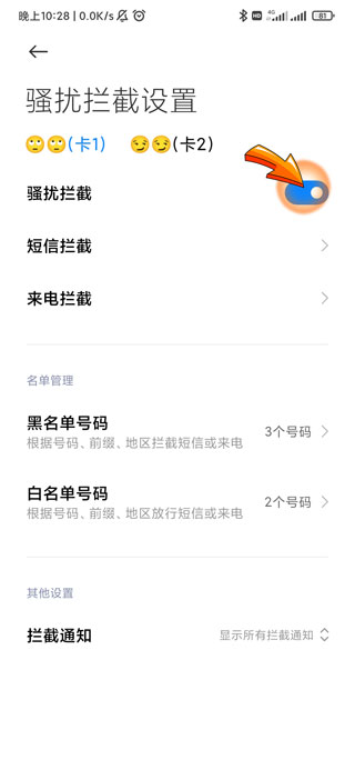 4、最后点击关闭“骚扰拦截”右侧的开关按钮即可。