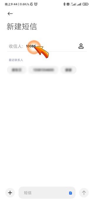 2、然后点击“收件人”输入栏,输入“10086”号码。