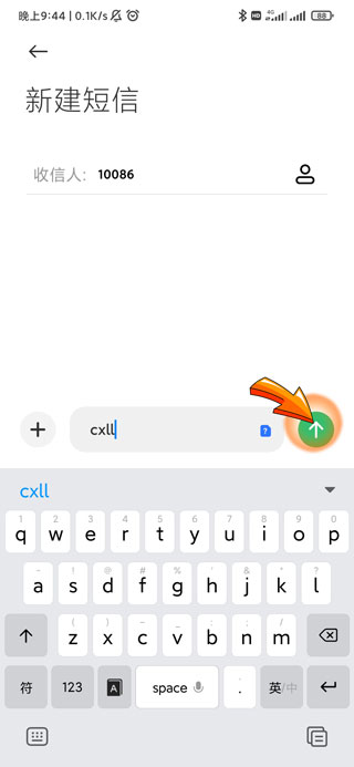 3、最后在短信内容中输入“cxll”,点击右侧的“发送”图标即可。