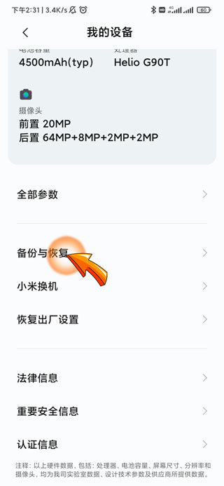 3、然后点击我的设备页面中的“备份与恢复”选项。