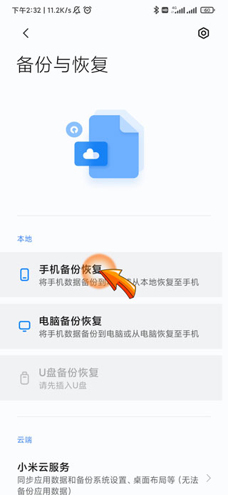 4、最后点击备份与恢复页面中部的“手机备份恢复”选项即可进行恢复。