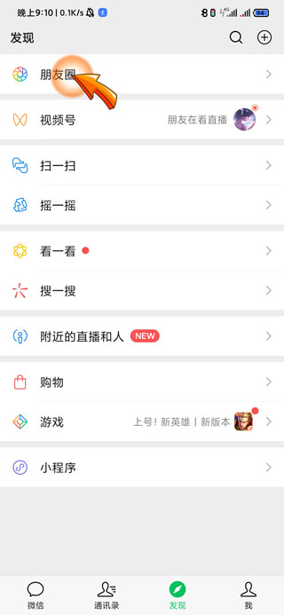 2、然后点击发现页面顶部的“朋友圈”选项。