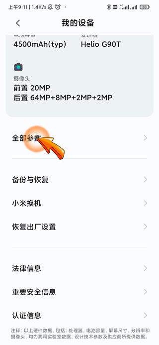 3、进入我的设备页面后,点击“全部参数”选项。