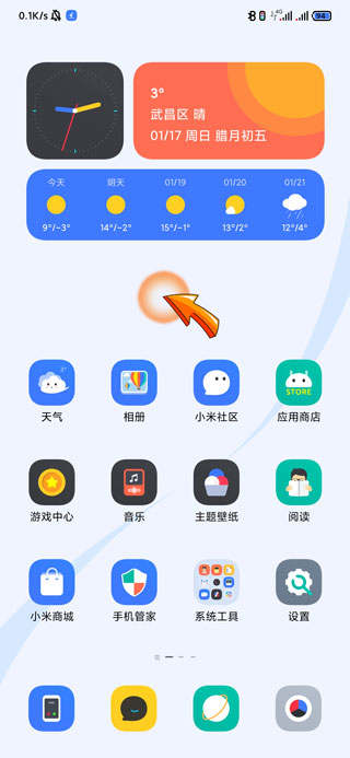 1、小米手机录屏开启声音首先需要打开桌面,手指放置空白处并且下滑页面。