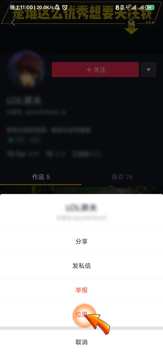 3、最后点击页面底部弹出窗口中的“拉黑”选项即可将对方拉黑。
