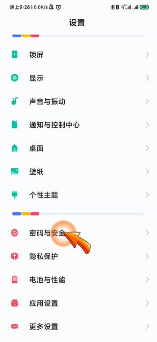 2、进入设置页面后,找到并点击“密码与安全”选项。