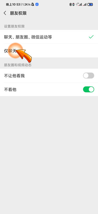 3、最后点击设置朋友权限下方的“仅聊天”选项即可屏蔽对方。