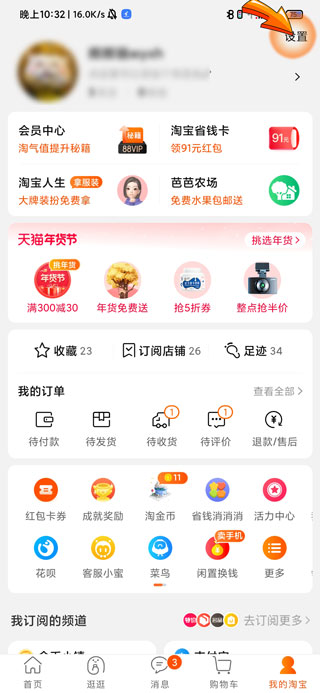 2、进入我的淘宝页面后,点击页面右上角的“设置”选项。