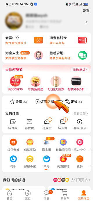2、在我的淘宝页面中部有一个“订阅店铺”选项,点击进入。