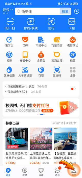1、支付宝更换实名认证首先需要打开支付宝APP,点击首页右下角的“我的”图标。