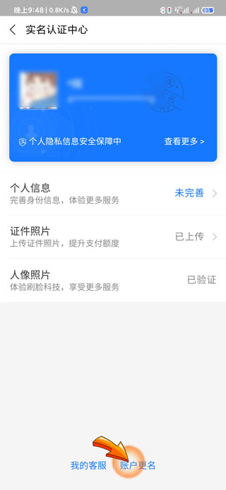 5、最后在实名认证中心页面中点击底部的“账户更名”选项即可更换实名认证。