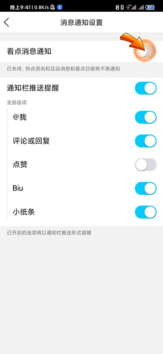 5、最后点击页面顶部的“看点消息通知”选项即可关闭qq看点推送消息