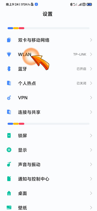 2、进入设置页面后找到并点击“WLAN”选项。