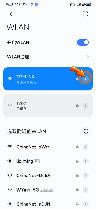 3、然后点击无线网名称右侧的“箭头”图标。