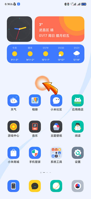 1、手机分屏设置首先需要打开手机桌面,手指点击桌面空白区域并上滑页面。
