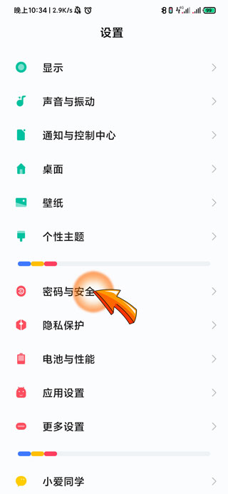 2、进入设置页面后,滑动页面找到并点击“密码与安全”选项。