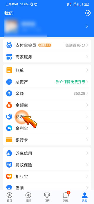 2、然后点击我的页面中的“花呗”选项。