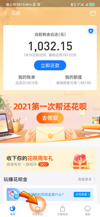 3、进入花呗页面后,点击页面底部的“花呗权益”选项。