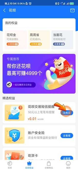 4、最后点击花呗交易短信提醒右侧的“去购买”选项即可。