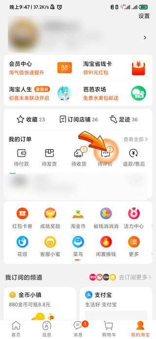 2、然后点击我的淘宝页面中的“待评价”图标。