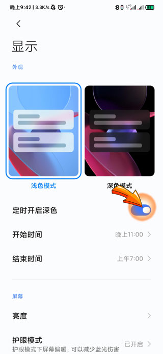 3、最后将“定时开启深色”右侧的开关关闭即可。