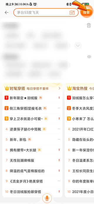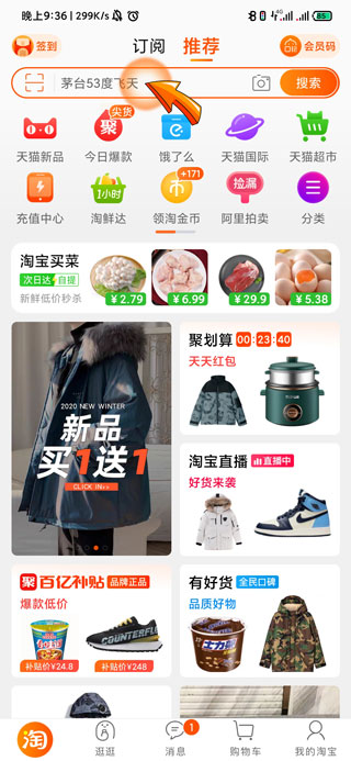 1、手机淘宝搜索店铺首先需要打开淘宝APP,点击首页顶部的“搜索框”图标。